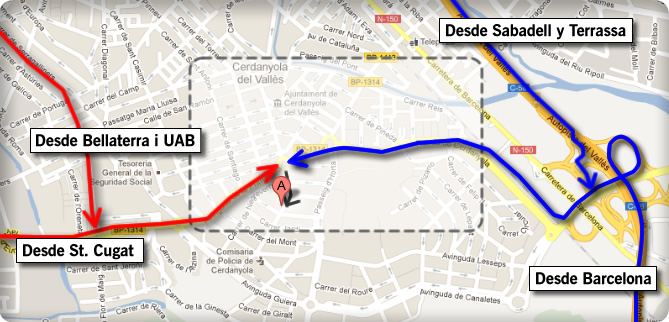 Se llega muy fácilmente a Cerdanyola desde Sabadell o Barcelona en coche por la autopista del Vallés C-58. Desde Sant Cugat se accede a Cerdanyola por el Parque Tecnológico del Vallés a través de la recientemente ampliada a carriles dobles BP-1314 (ver mapa) que se convierte en la ronda de Cerdanyola y girando hacia el ayuntamiento en la Plaça de l'Estatut (conocida popularmente como “la plaza de la C” por el enorme monumento en forma de “C” que hay en el centro).
